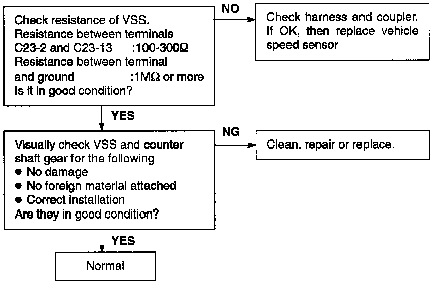 Separately from the above inspection, vehicle speed sensor itself can be checked on its resistance by disconnecting coupler.