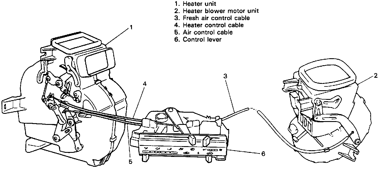 After installing control cables to control levers,move control levers to such position as to pull cables fully, then connect and clamp control cables to heater unit and blower motor unit levers as shown.