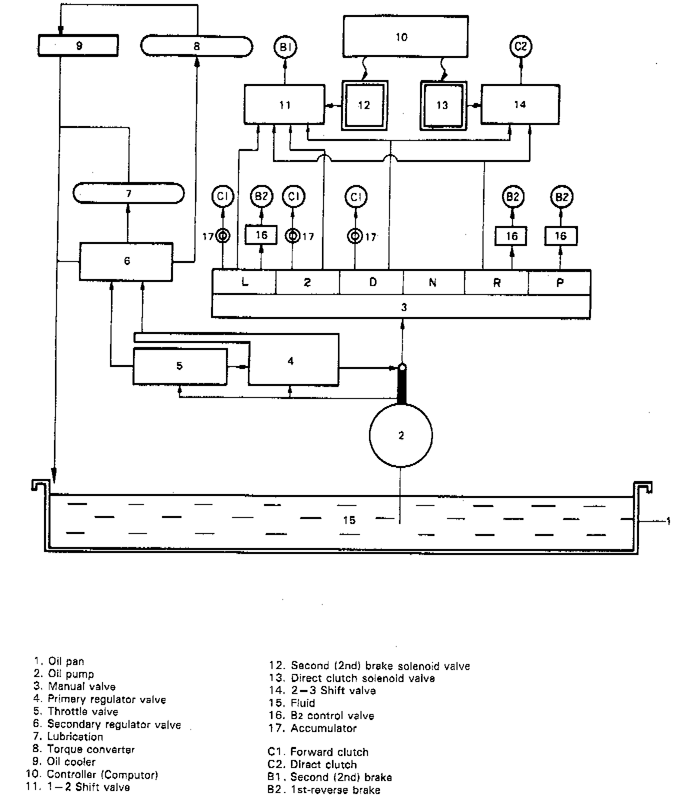 The oil pressure control system fundamentally consists of three parts: (1) oil pressure producing system which consists of an oil pump to produce oil pressure and regulator valve to regulate the pressure, (2) oil circuit to feed fluid into the torque converter, the oil cooler and the transmission components to be lubricated, and (3) control system to shift the gear of the planetary gear unit by acting on each clutch and brake.