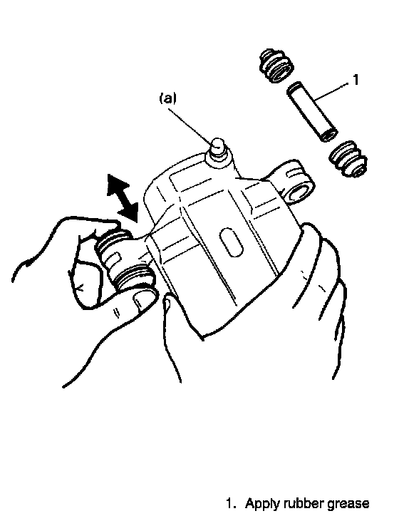 Check boots for breakage, crack and damage. If defective, replace. Apply rubber grease to bush outer surface. Make sure that each bush slides easily through each caliper bolt hole.