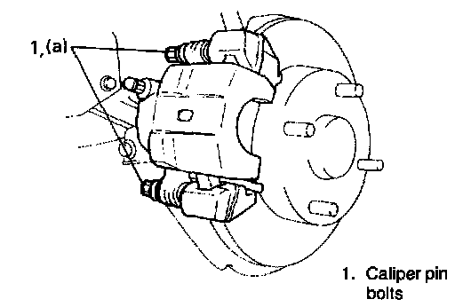 2. Remove brake flexible hose mounting bolt from caliper. As this will allow fluid to flow out of hose, have a container ready before hand.