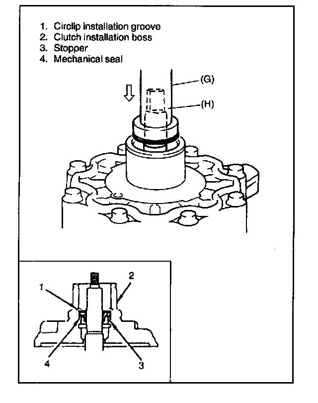 3. Using special tool (G), press it slowly by hand until mechanical seal contacts the stopper of clutch installation boss.
