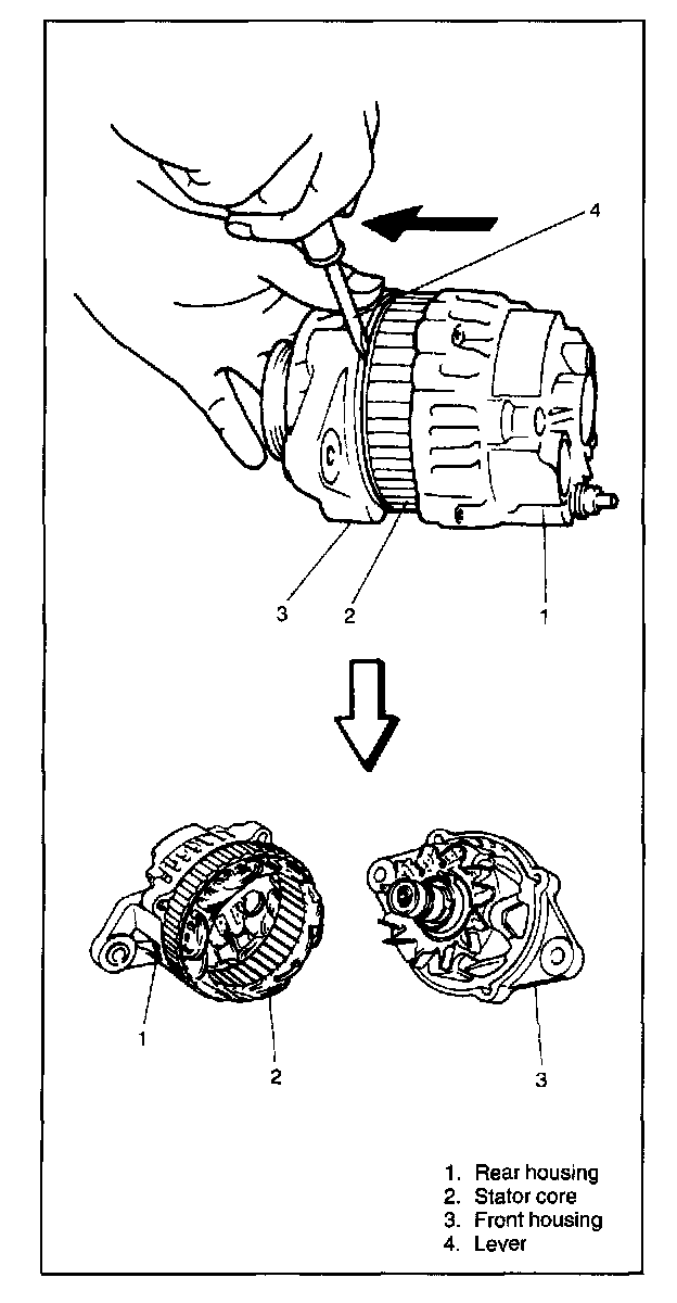 3. Then with lever inserted between stator core and front housing, separate generator into front and rear sides.