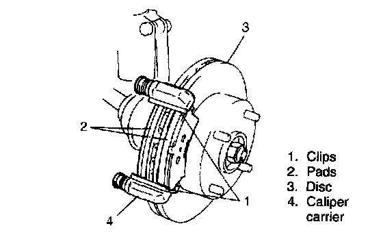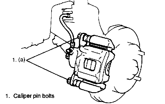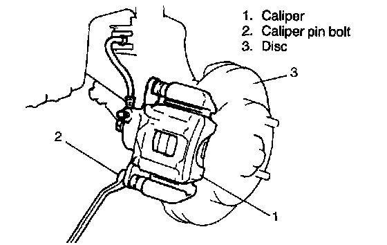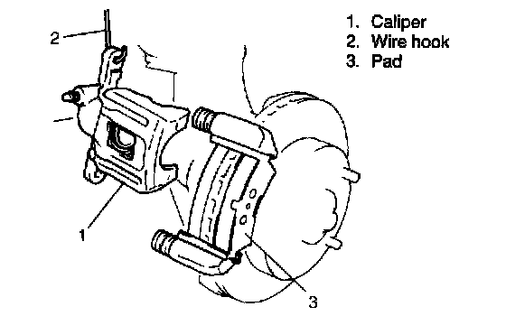 NOTE: Hang removed caliper with a wire hook or the like so as to prevent brake hose from bending and twisting excessively or being pulled. Don't operate brake pedal with pads removed.