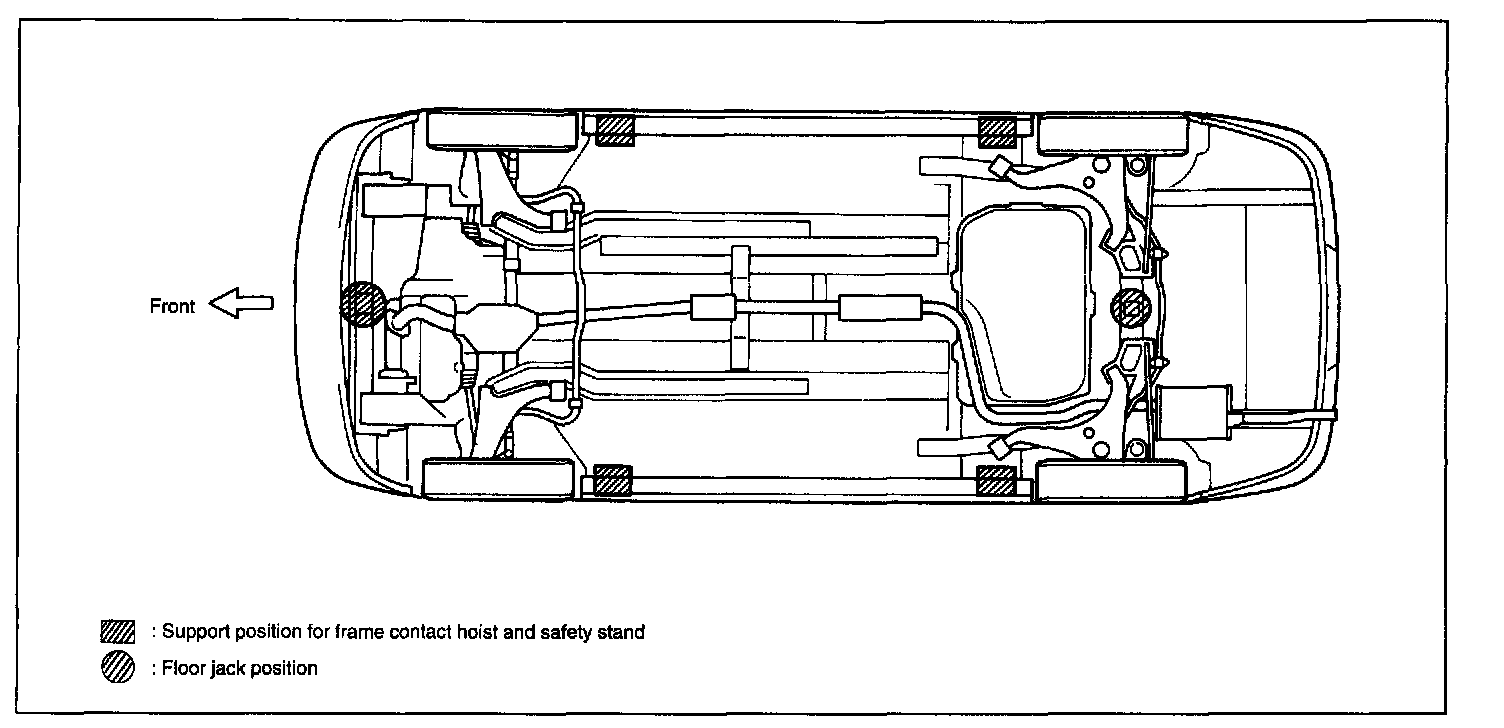 To perform service with either front or rear vehicle end jacked up, be sure to place safety stands under body so that body is securely supported. And then check to ensure that body does not slide on safety stands and the vehicle is held stable for safety's sake.