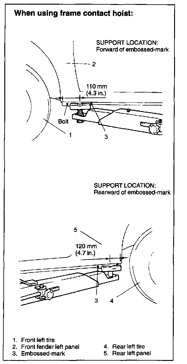 - When using frame contact hoist, apply hoist as shown in figure. Lift up the vehicle till 4 tires are a little off the ground and make sure that the vehicle will not fall off by trying to move vehicle body in both ways. Work can be started only after this confirmation.