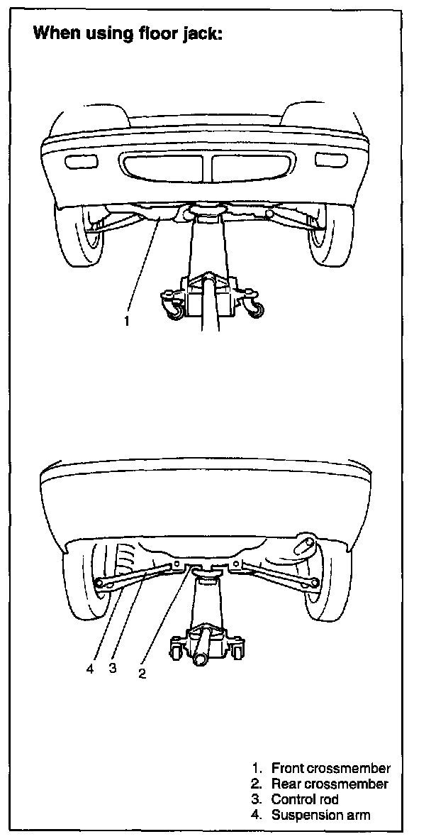 In raising front or rear vehicle end oft the floor by jacking, be sure to put the jack against the center portion of the front or rear cross- member.