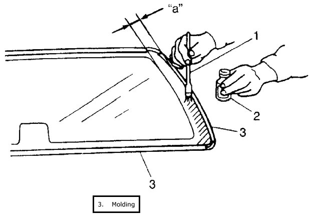 9. Apply adhesive (1) along upper and lower molding (3) as shown.