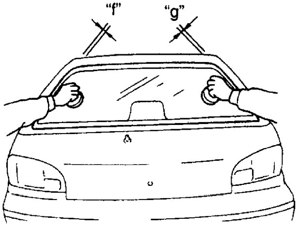 11. Holding rubber sucker grips, press glass against door so that clearances "f" and "g" become even.