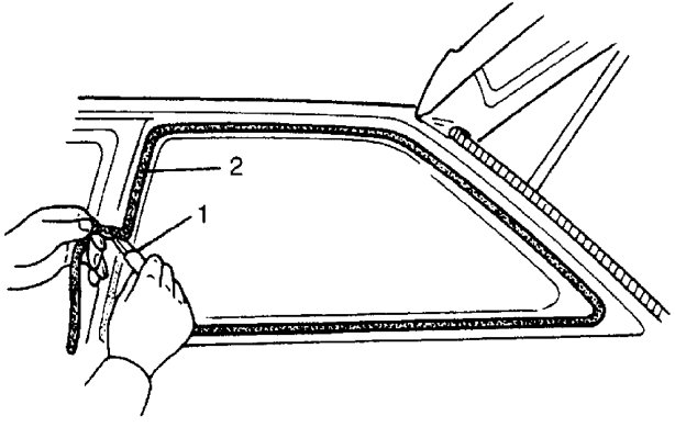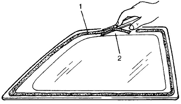 8. When re-using glass, remove adhesive (1) from glass, using care not to damage primer coated surface (2).
