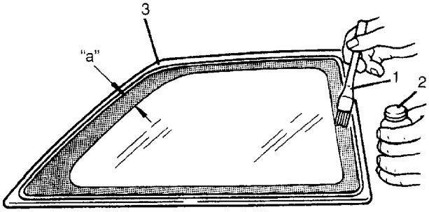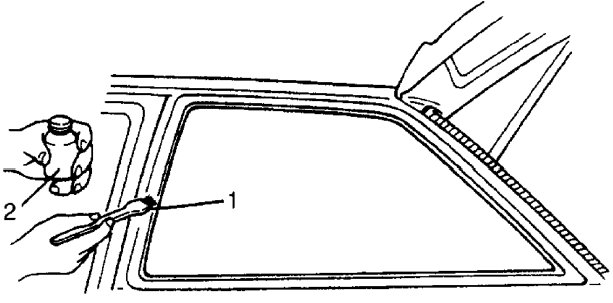 2. Using a new brush (1), apply sufficient amount of primer (2) for body along body surface where window is to be adhered.