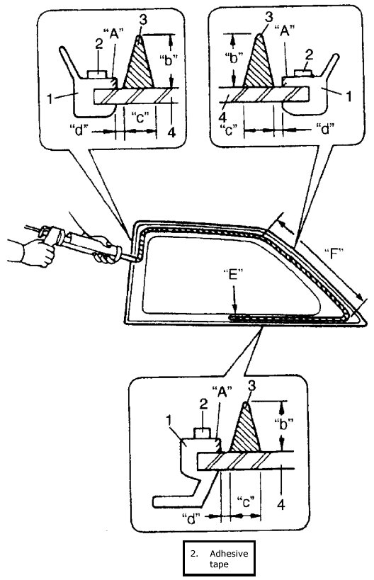 - As for rear side "F" of glass, apply adhesive so that shape of the adhesive applied part matches shape of primer coated part of body (as in Step 2)).
