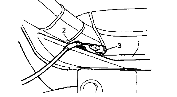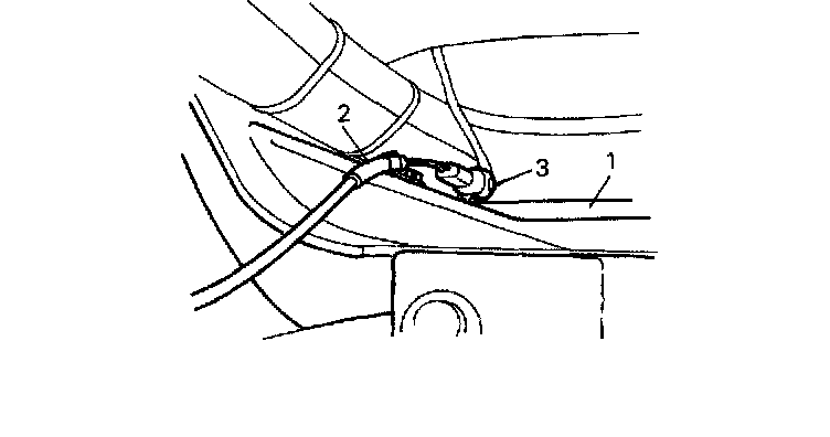 4) For vehicles equipped with ABS, detach ABS wheel speed sensor connector (3) and harness (2) (right and left) from suspension frame (1) and control rods.