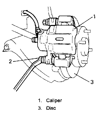 NOTE: Hang removed caliper with a wire hook (2) or the like so as to prevent brake hose from bending and twisting excessively or being pulled. Don't operate brake pedal with pads (3) removed.