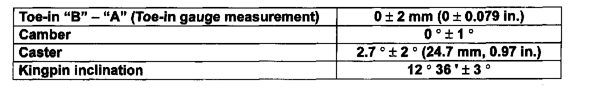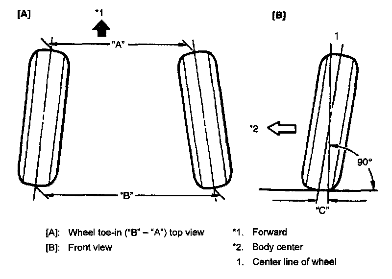 Toe is the turning in or out of the front wheels. The purpose of a toe specification is to ensure parallel rolling of the front wheels (Excessive toe-in or toe-out may increase tire wear). Amount of toe can be obtained by subtracting "A" from "B" as shown in the figure and therefore is given in mm (inch).