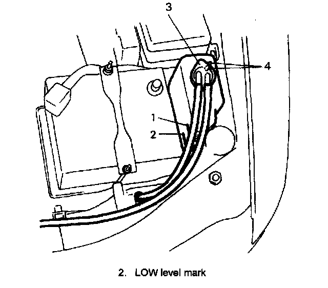 6. Add coolant to reservoir tank so that its level aligns with Full mark (1). Then, reinstall cap (3) to reservoir tank aligning match marks (4) on the tank and cap.