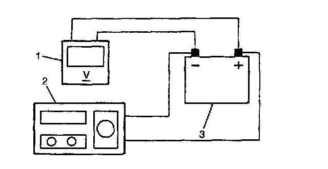 1. Connect voltmeter (1) and battery load tester (2) across battery (3) terminals.
