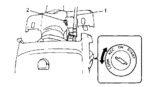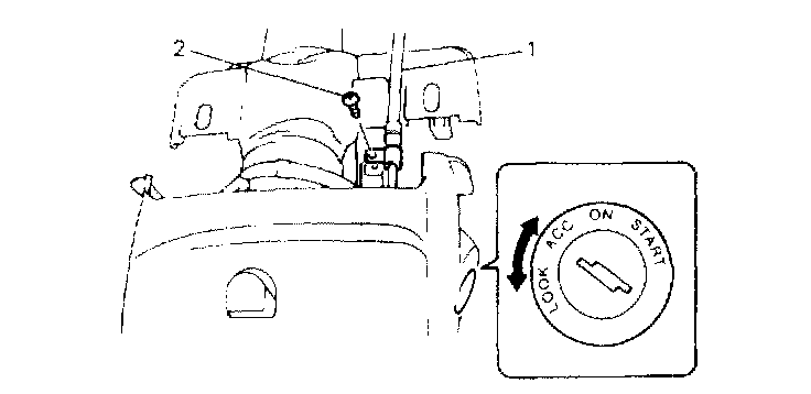 13) With A/T vehicle, remove shift (key) interlock cable screw (2) and then disconnect interlock cable (1) from ignition switch with ignition switch turned at "ACC" position. After disconnecting, turn ignition switch to "LOCK" position.
