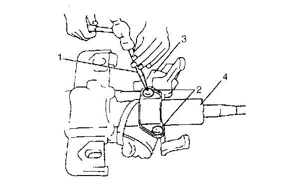 4) Using center punch (1) as shown, loosen and remove steering lock mounting bolts (2).