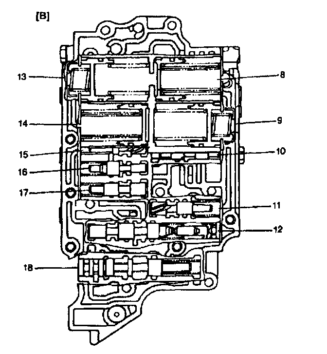 When the gear is shifted to the "R" range, as the hydraulic pressure is also applied to (5), increasing the force to raise the valve the hydraulic pressure (line pressure) is adjusted to a higher value than in any other range.
