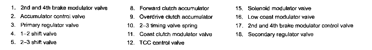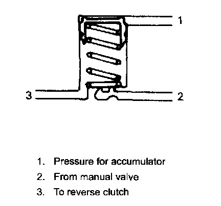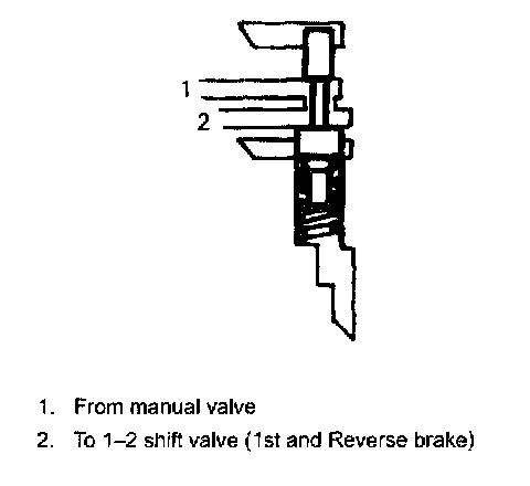 The hydraulic pressure is fed from the manual valve through (1) and after being adjusted in the valve, it is transmitted through (2) and 1-2 shift valve to the 1st and Reverse brake valve.