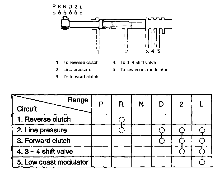 This valve switches the fluid passage. As it is connected with the shift lever at the drivers seat through a linkage, it selects a fluid passage corresponding to each range of "P", "R", "N", "D", "2" or "L" as selected by the shift lever.