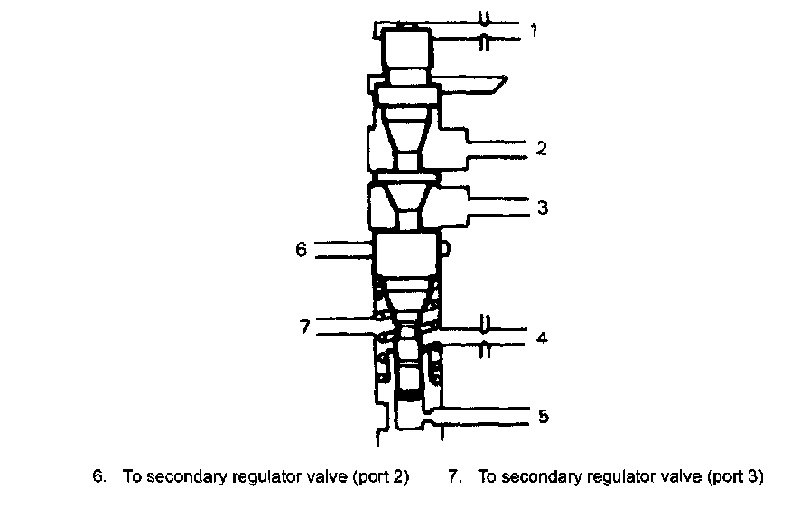 In this way, as the valve moves up and down, the line pressure is released through drain (2) so that it is adjusted according to the state of the throttle pressure. From (6) and (7), the hydraulic pressure is sent to the secondary regulator valve.