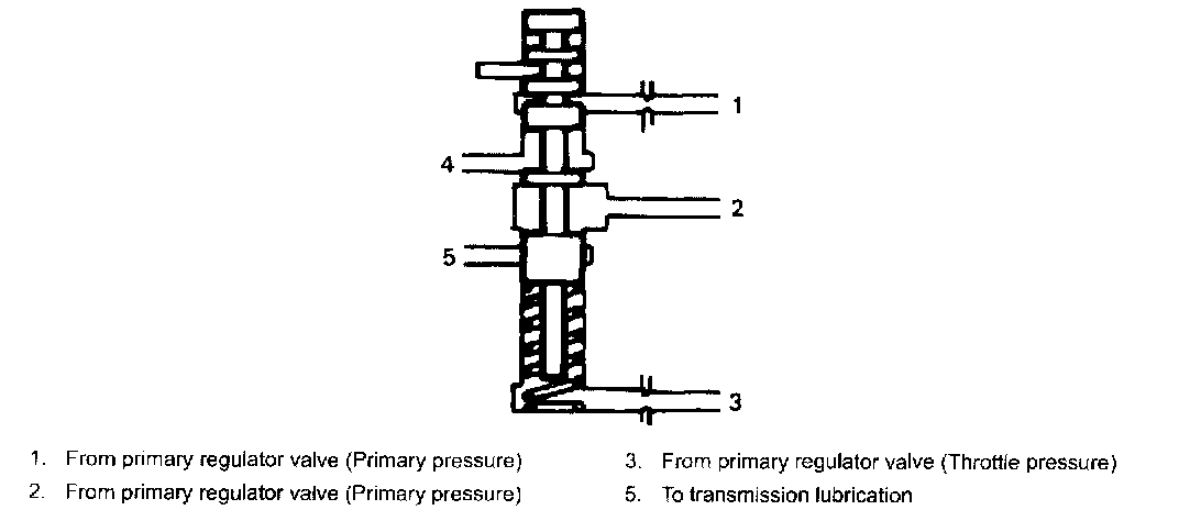 On the other hand, the throttle pressure through the primary regulator valve is applied to (3), trying to raise the valve together with the spring force.