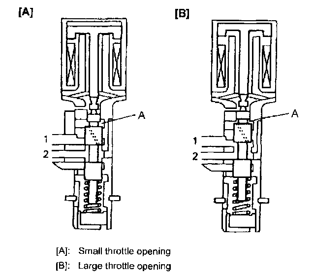 As TCM increases the amount of electric current supplied to the solenoid, the plunger moves down largely and the force to push the valve downward becomes larger. As a result, the valve lowers and the valve opening between (1) and (2) reduces, resulting in lower throttle pressure.