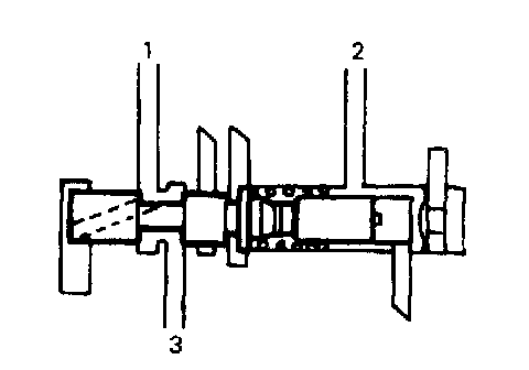 As the throttle pressure applied to (2) increases, the valve moves to the left to control the line pressure (1) and the hydraulic pressure (3) rises. Conversely, as the throttle pressure applied to (2) reduces, the valve moves to the right to control the line pressure (1) and hydraulic pressure (3) drops.