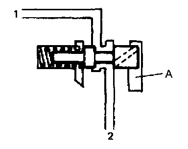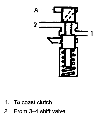 This valve adjusts the hydraulic pressure to the coast clutch when the gear is in the 1st, 2nd and 3rd and R ranges. The hydraulic pressure (line pressure) coming through (2) passes the fluid passage in the valve, enters chamber (A) and pushes the valve downward. At the same time, however, as spring force pushes the valve upward, the hydraulic pressure is adjusted and applied through (1) to the coast clutch.
