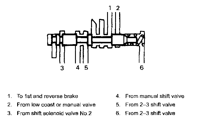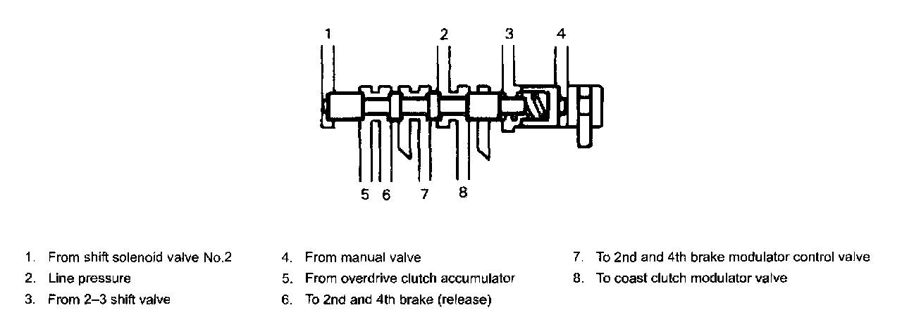 When in the 3rd gear, as hydraulic pressure (line pressure) is not applied to (1), this valve moves to the left and the hydraulic pressure applied to (2) passes through the valve, (8) and the coast clutch modulator valve to operate the coast clutch. Meantime, the hydraulic pressure is applied to (5) passes through the valve and (6) to be applied to the 2nd and 4th brake which is thus released.