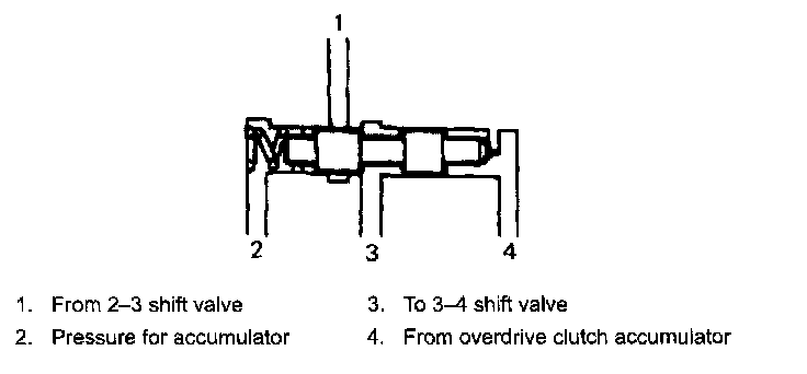When in the 3rd gear, as the hydraulic pressure (line pressure) is applied to (5), this valve moves to the right and the hydraulic pressure applied to (3) passes through the valve, (7) and 3-4 shift valve to be applied to the 2nd and 4th brake which is thus released.