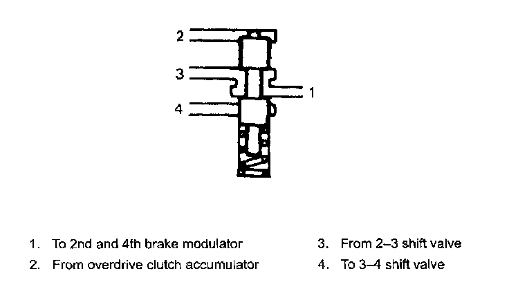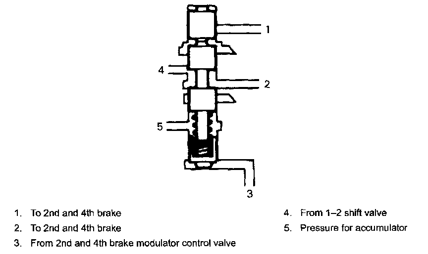 When in the 4th gear, as the hydraulic pressure passes through (2), the valve moves down. Then the hydraulic pressure (line pressure) applied to (4) passes through the valve and (1) to act on the 2nd and 4th brake modulator valve.