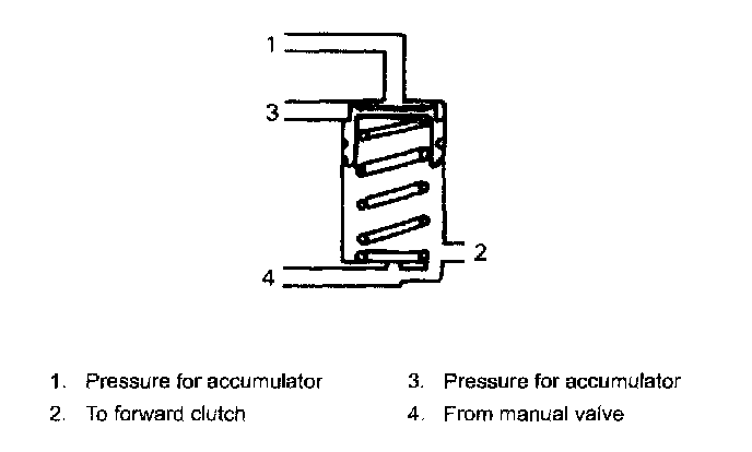 As the hydraulic pressure controlled according to the throttle conditions by the accumulator control valve is applied to (1) and (3), the hydraulic pressure applied to (4) is depressurized temporarily and then transmitted through (2) to the forward clutch.