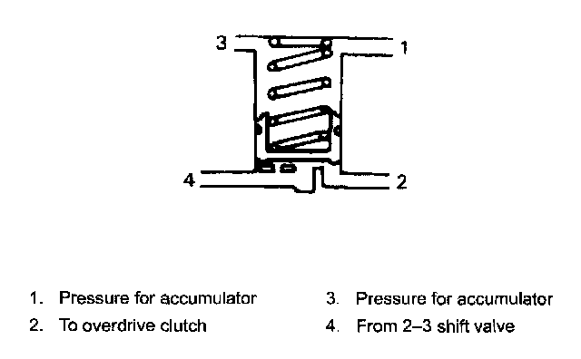 This valve adjusts the hydraulic pressure to the 2nd and 4th brake engagement side when the gear is in the 2nd, 3rd and 4th gears. As the line pressure is applied to (3) when in the 2nd and 4th gears, the valve is fixed at the upper position and the line pressure is transmitted as it is from (4) to (2). When in the 3rd gear, as the line pressure is not applied to (3) and the valve is held by spring force, the hydraulic pressure (line pressure) applied to (4) is adjusted and transmitted to (2).
