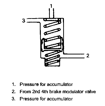 When in the 2nd gear, as the hydraulic pressure is not applied to (2), the valve moves up. The hydraulic pressure (line pressure) applied to (3) passes through the valve and (1) to act on the 2nd and 4th brake modulator valve.