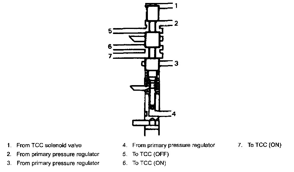 When TCC is working, the TCC control solenoid turns ON to allow the hydraulic pressure to be applied to (1) and the valve moves downward.