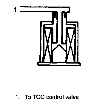 When the solenoid is ON, as the plunger is pulled up to close the fluid passage, the hydraulic pressure applied to (1) is maintained and the TCC control valve moves down.