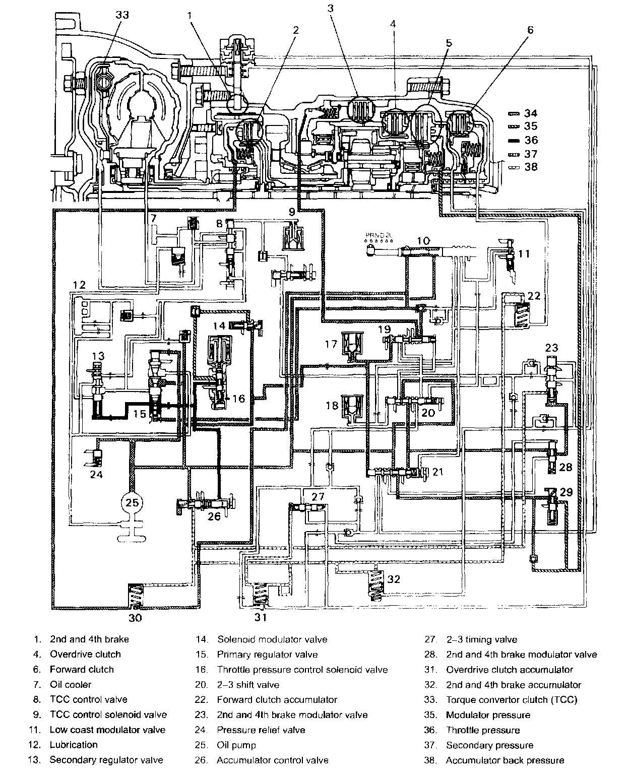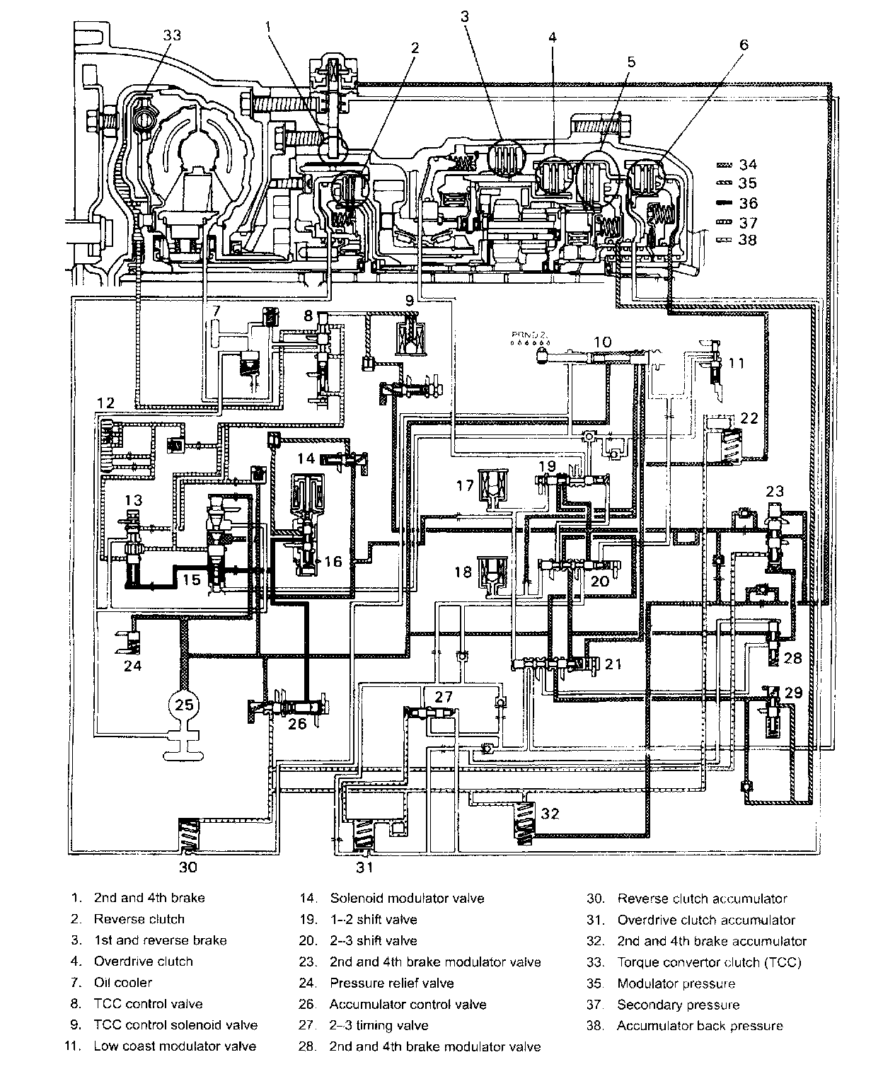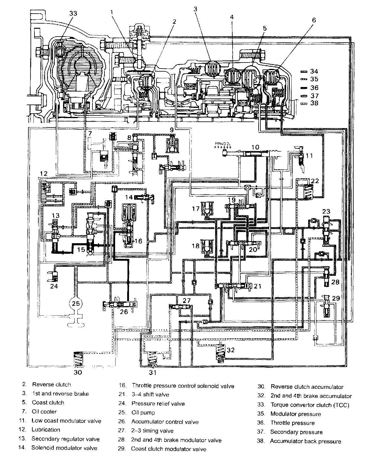 Also, the line pressure passing through the manual valve and acting on the 1-2 shift valve passes the 2-3 shift valve and overdrive clutch accumulator (31) to cause the overdrive clutch (4) to engage. When running at a constant speed, as the TCC control solenoid valve (9) turns ON and the TCC control valve (8) moves down, the hydraulic pressure coming from the primary regulator valve (15) passes through the TCC control valve to operate the TCC.