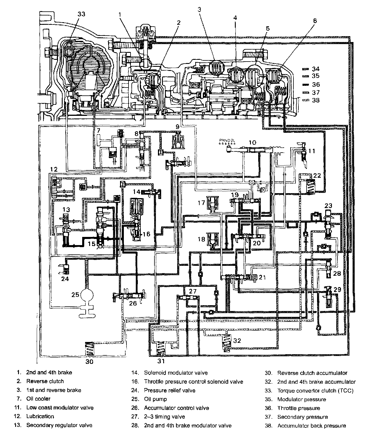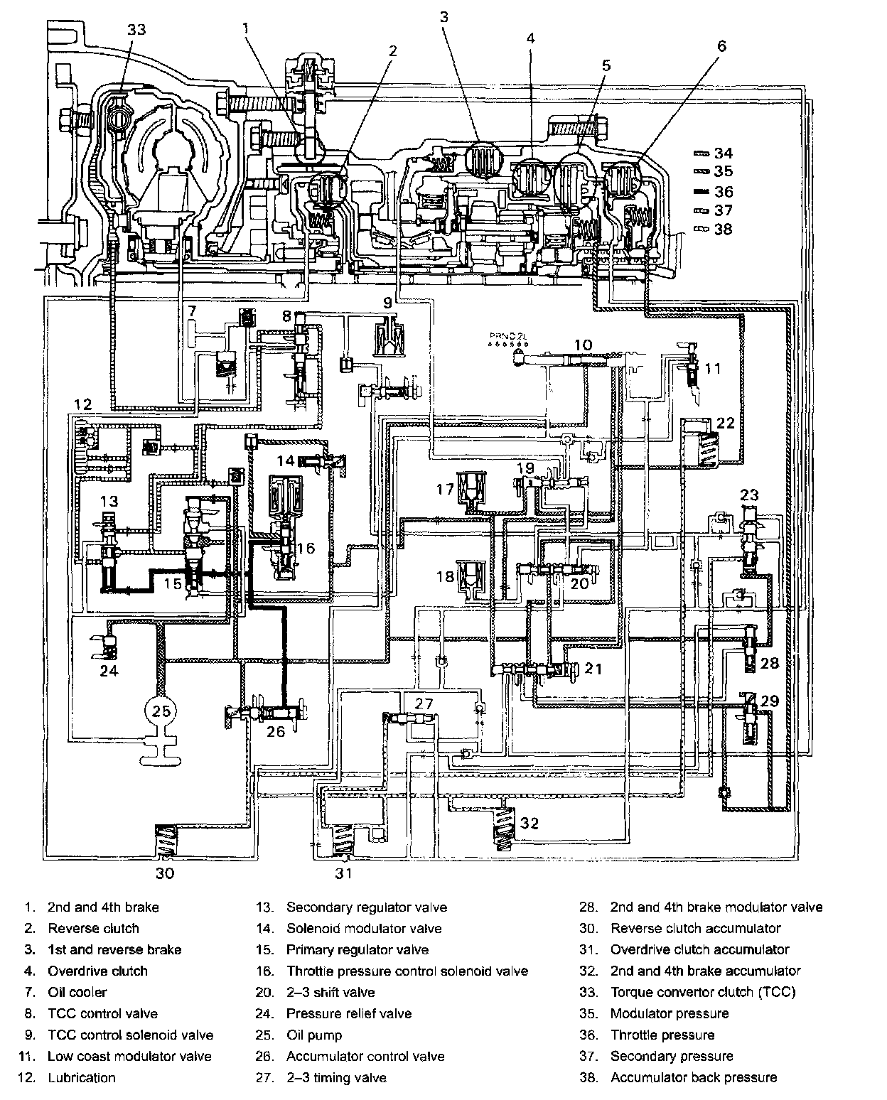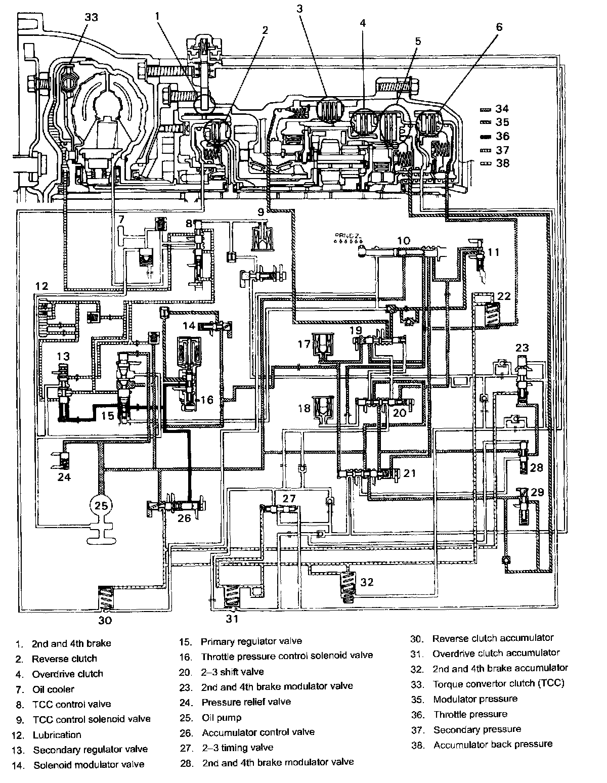Also, the line pressure passing through the manual valve and acting on the 1-2 shift valve passes the 2-3 shift valve and overdrive clutch accumulator (31) to cause the overdrive clutch (4) to engage. When running at a constant speed, as the TCC control solenoid valve (9) turns ON and the TCC control valve (8) moves down, the hydraulic pressure coming from the primary regulator valve (15) passes through the TCC control valve to operate the TCC.