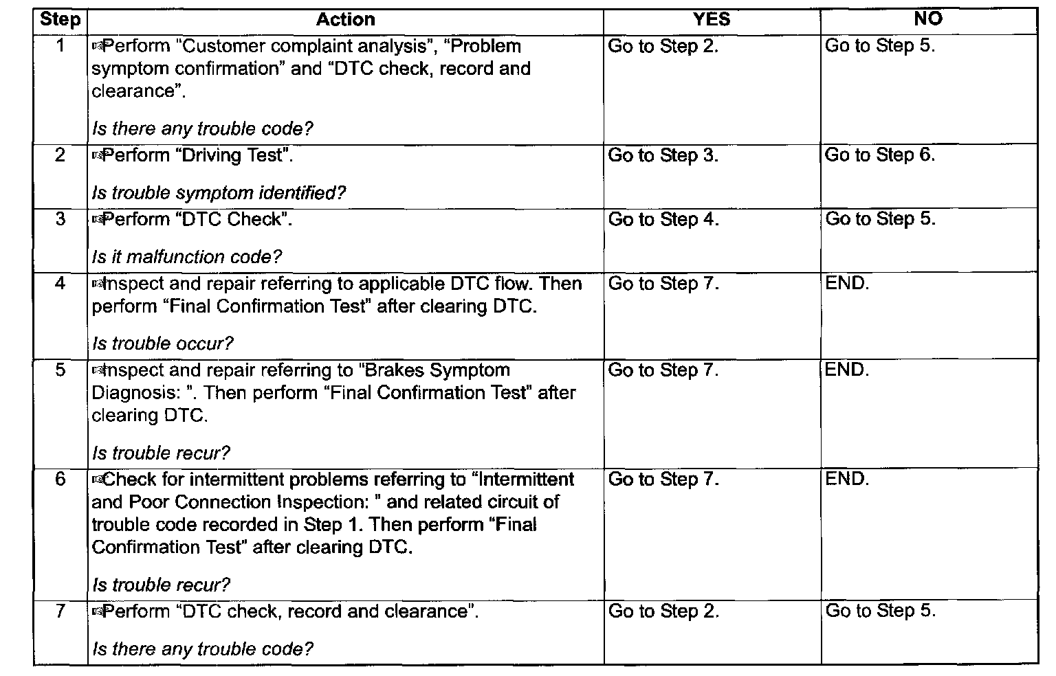 Perform "DTC Check:", record it and then clear it. If the malfunction DTC which was once displayed and then cleared cannot be detected (indicated) again when the ignition switch is turned ON, attempt to diagnose the trouble based on the DTC recorded in this step may mislead the diagnosis or make diagnosing difficult. Proceed to Step 4 to check ABS control module for proper self-diagnosis function.