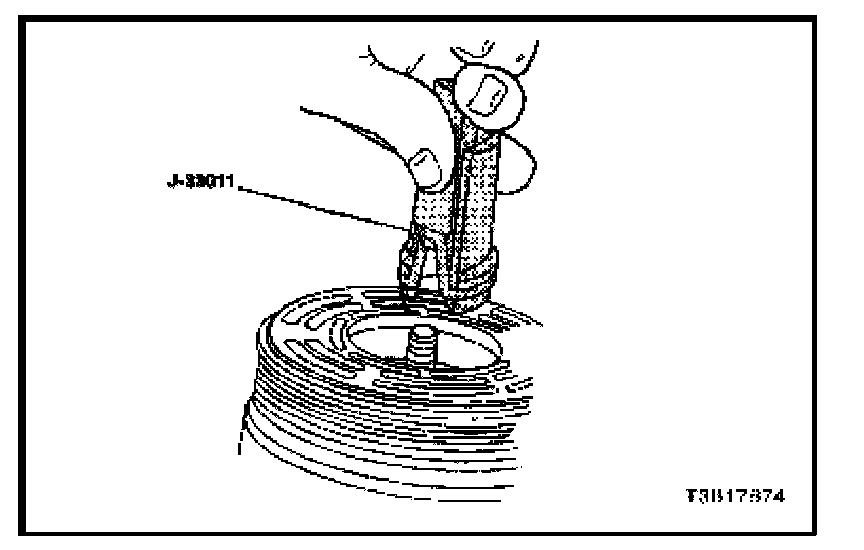 2. Insert the O-ring installer J-33011 into the compressor neck until the installer "bottoms". Lower the moveable slide of the O-ring installer J-33011 to release the O-ring into the seal Oring lower groove. (The top groove of the compressor neck is for the shaft seal retainer ring.) Rotate the installer to seat the O-ring and then remove the installer.