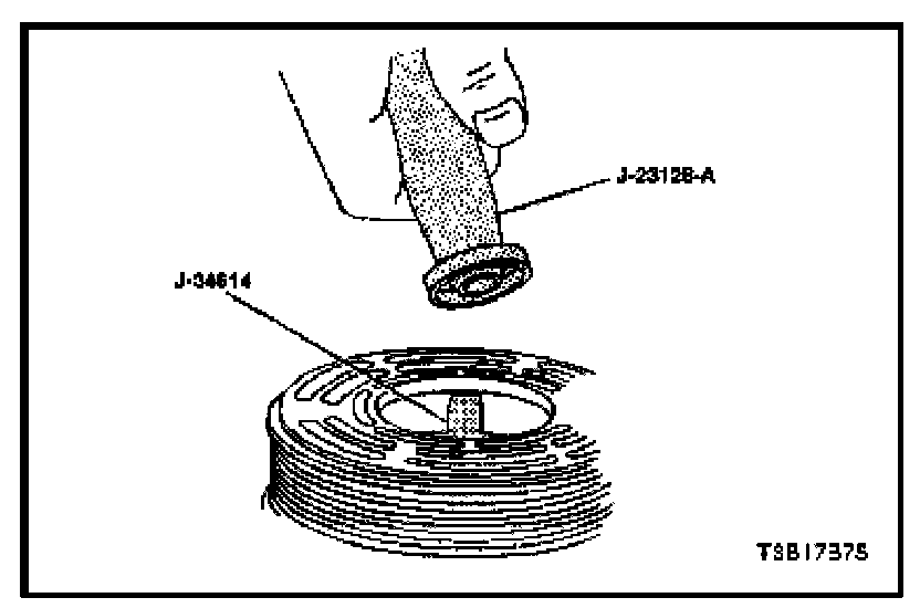 7. Fully engage the knurled tangs of the seal seat remover/installer J-23128-A into the recessed portion of the seal by turning the handle clockwise. Remove and discard the seal from the compressor with a rotating-pulling motion. The handle should be hand-tightened securely. Do not use a wrench or pliers to tighten the handle.