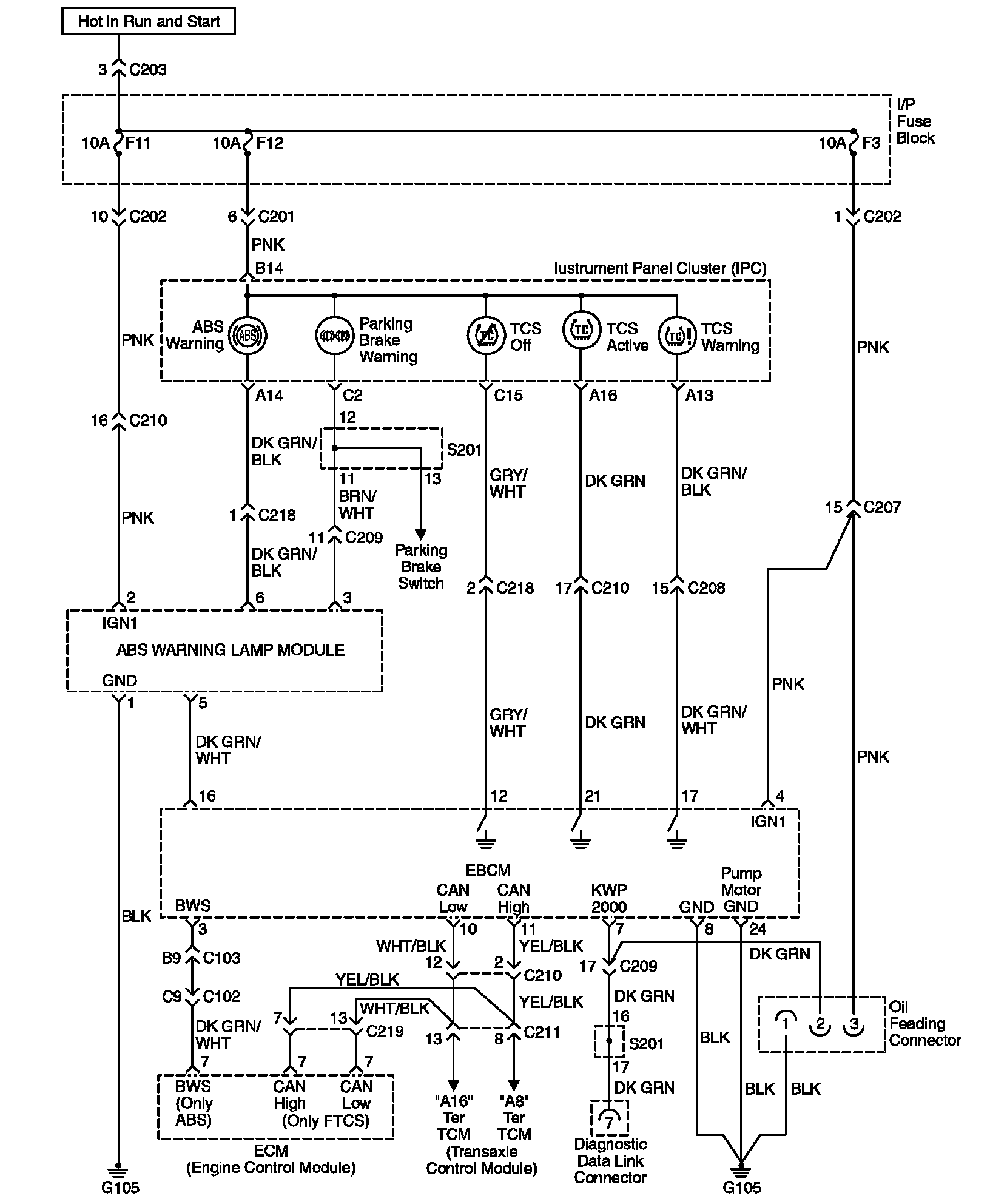 The Electronic Brake Control Module (EBCM) controls the operation of the TCS warning lamp. Battery voltage is supplied to the I/P Cluster terminal B14 when the ignition switch is turned on EBCM terminals 9 and 25 are hot at all times.
