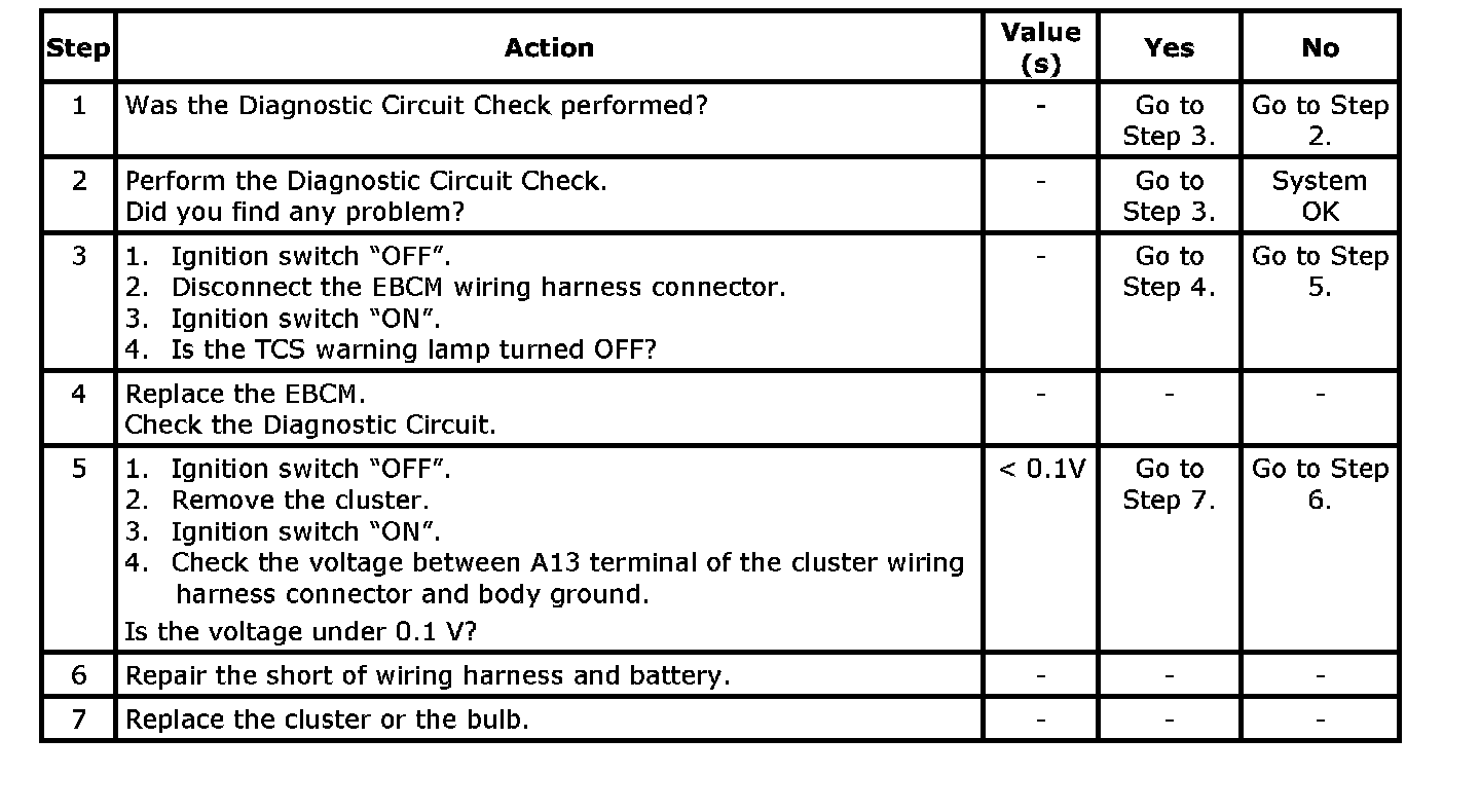 Typical cause of the TCS warning Lamp ON with no DTC(s) set is mainly EBCM wiring harness short to battery.