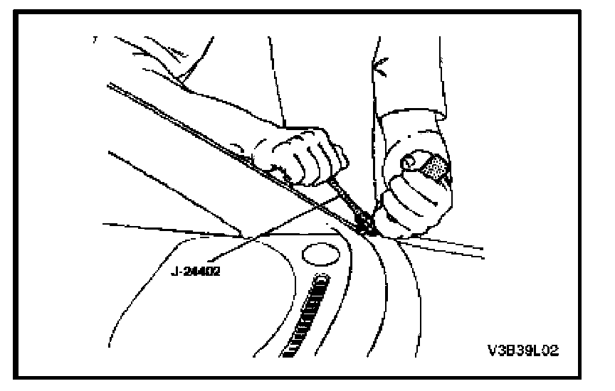 4. Using the glass sealant remover J-24402, cut the adhesive around the windshield.