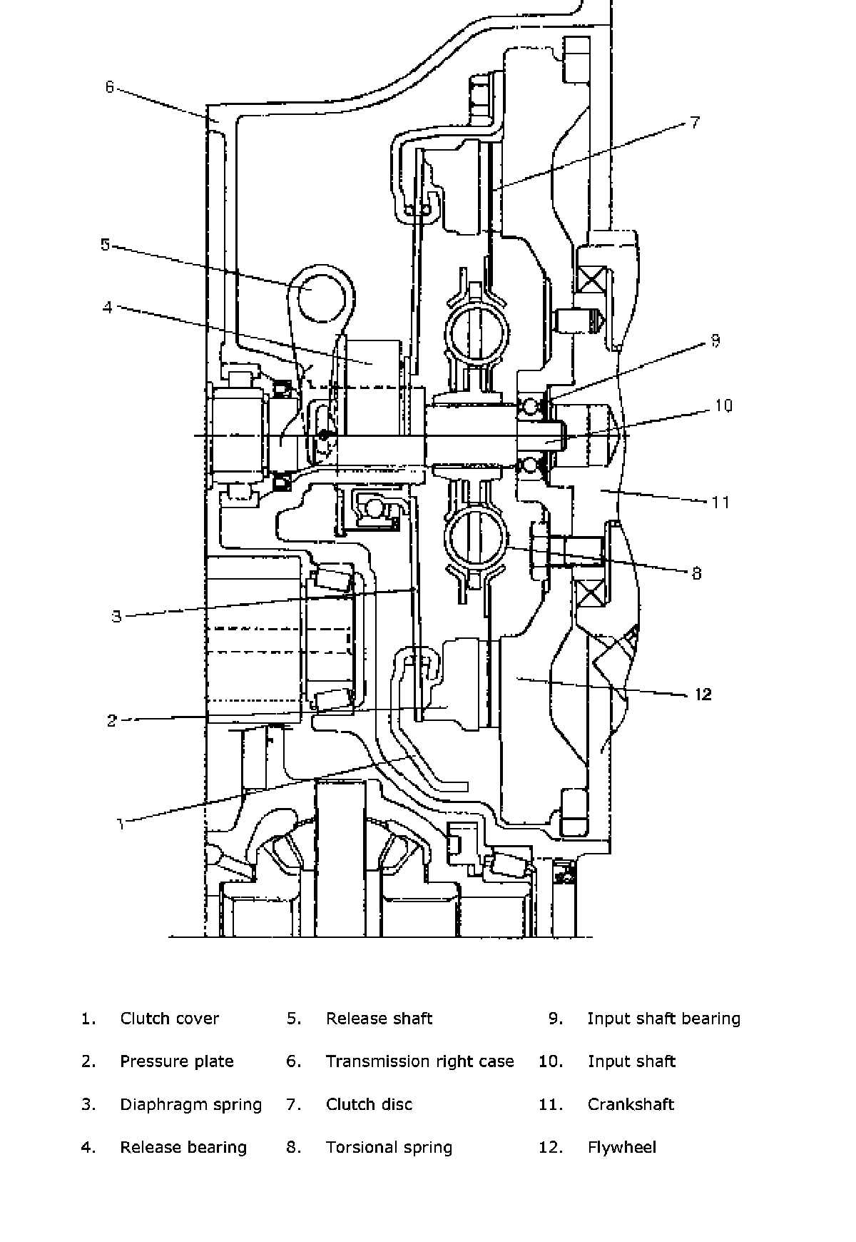 Clutch ConstructionThe clutch is a hydraulically controlled diaphragm spring clutch of a dry single disc type. The diaphragm spring is of a tapering-finger type, which is a solid ring in the outer diameter part, with a series of tapered fingers pointing inward.