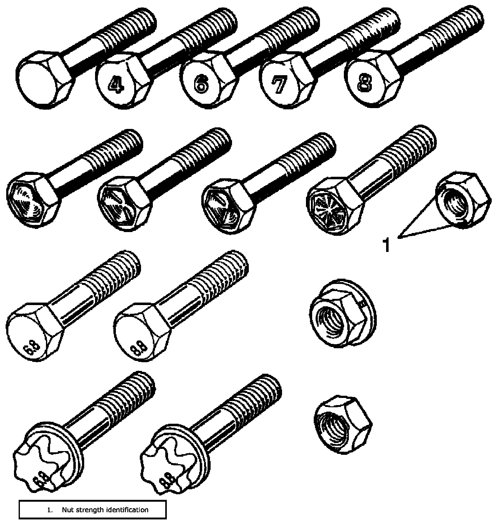 Metric bolts: Identification class numbers or marks correspond to bolt strength (increasing numbers represent increasing strength).