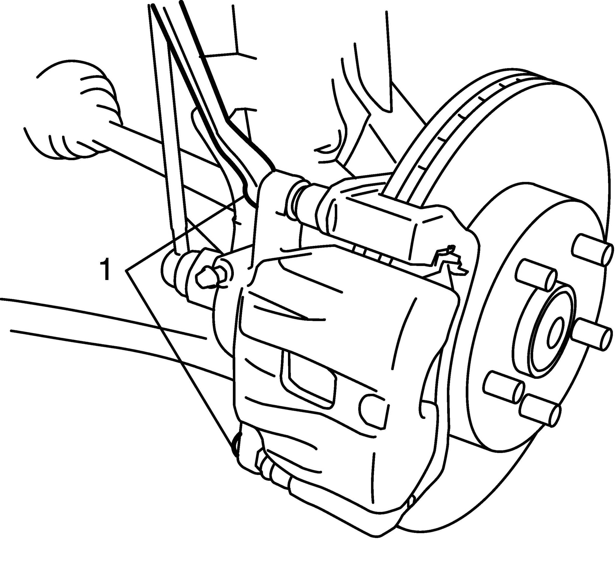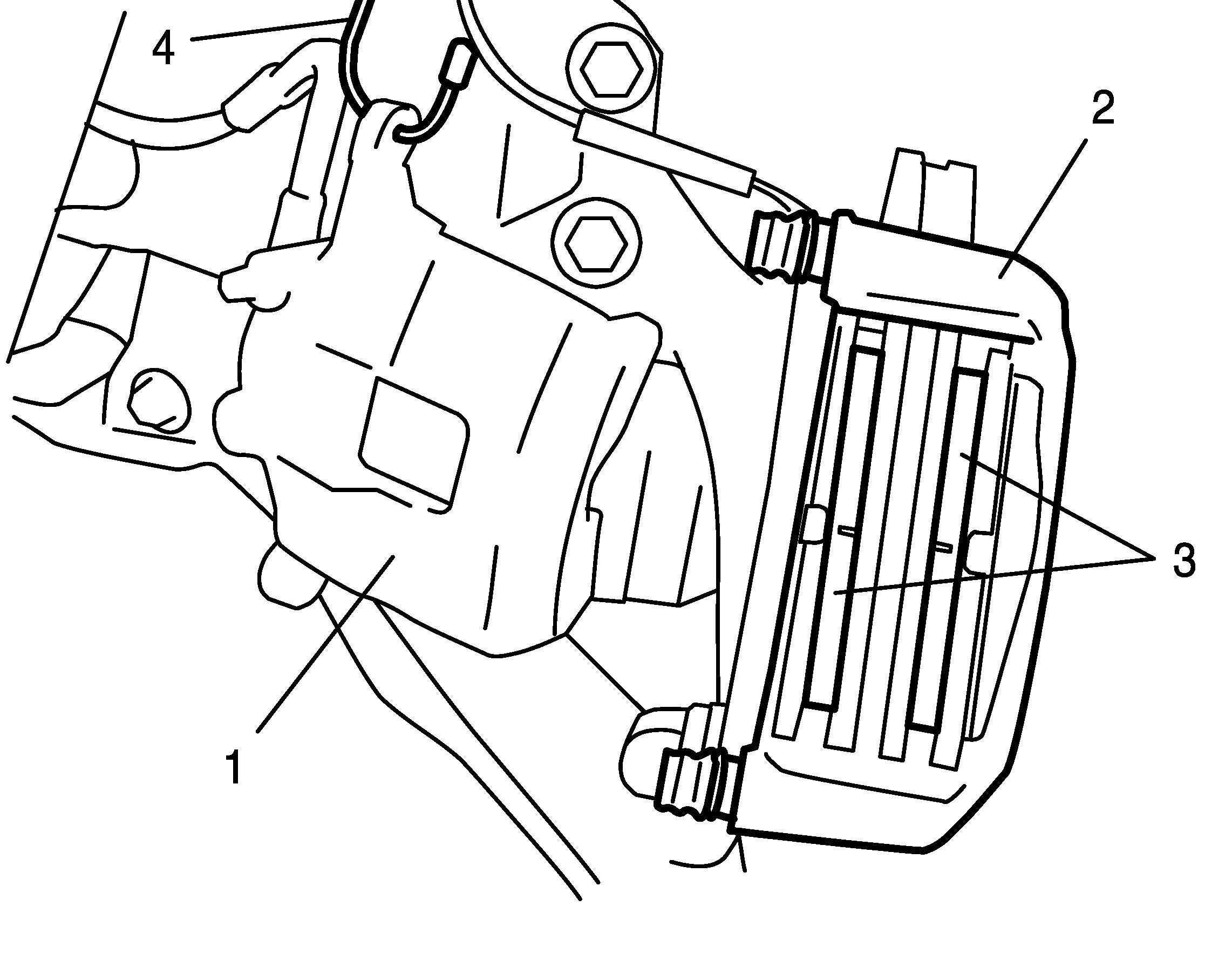 NOTE: Hang removed caliper (1) with a wire hook (4) or the like so as to prevent brake hose from bending and twisting excessively or being pulled. Don't operate brake pedal with brake pads removed.